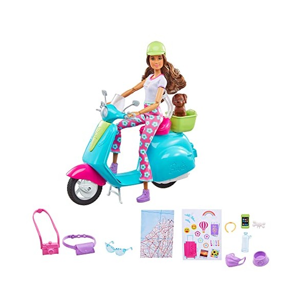 Gli accessori ispirati ai viaggi includono una mappa, una bottiglia d'acqua, uno smartphone, una mascherina per il viso, una ciotola per il cane e un bocconcino, oltre a un foglio di adesivi per personalizzare il giro di Barbie.