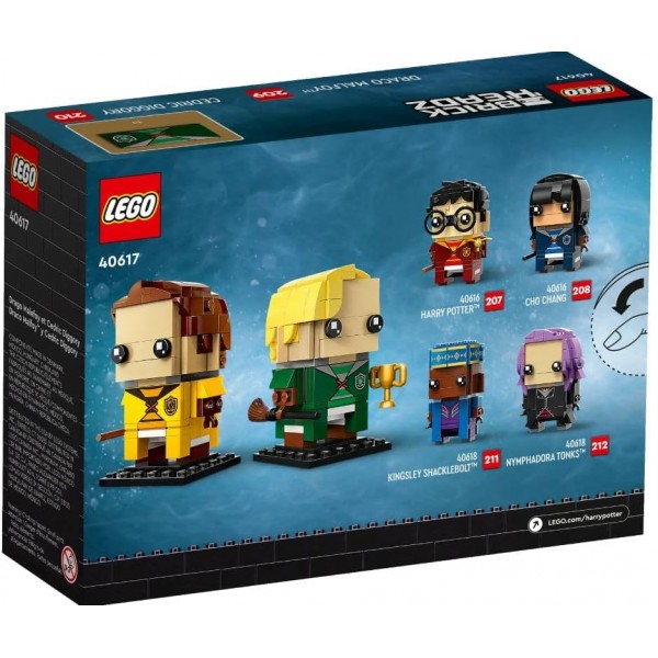 Con questi personaggi LEGO® BrickHeadz™ di Draco Malfoy™ e Cedric Diggory (40617), i fan di Harry Potter™ potranno ricordare le avvincenti partite di Quidditch™. I personaggi in mattoncini indossano le divise da Quidditch delle case di Serpeverde e Tassorosso. Un regalo LEGO di grande ispirazione per i bambini di 10+ anni, il set include una coppa della casa e 2 accessori a forma di scopa per completare un display davvero incantato.