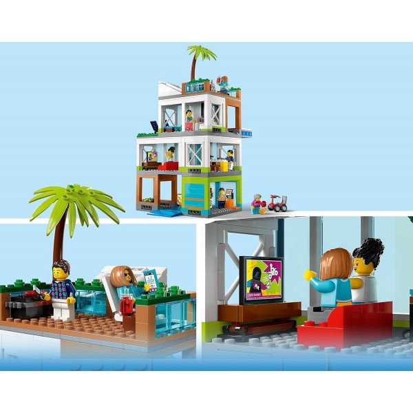 Questi Condomini di altissima qualità 6+ LEGO® City (60365) sono dotati di moduli con stanze combinabili e numerosi dettagli interni per il gioco di fantasia, tra cui un minimarket, un soggiorno, una cucina, una camera da letto e un bagno completo di toilette e vasca. Il set include anche uno scooter di mobilità, una bicicletta, 6 minifigure e una base stradale LEGO per collegarlo ad altri set della gamma LEGO City.