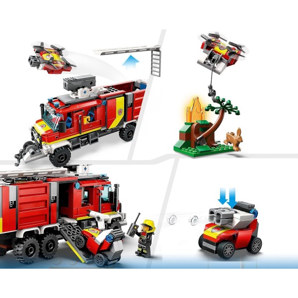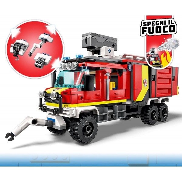 Questo camion dei pompieri giocattolo ricco di caratteristiche è dotato di un centro di controllo staccabile, un drone volante e uno da terra.I bambini possono lanciare diversi elementi dal camion e dal drone volante per domare l’incendio con acqua e schiuma. Basta aggiungere le ambientazioni della foresta e della città in fiamme e 3 minifigure per trascorrere ore e ore di divertimento antincendio ricco di azione!