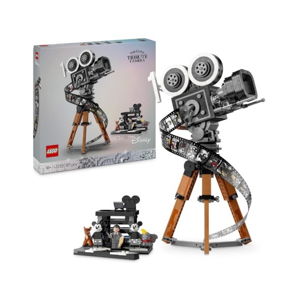 Mostra la tua passione per tutto ciò che è Disney con questo accattivante set Cinepresa omaggio a Walt Disney LEGO® ǀ Disney (43230) per adulti. Questo dettagliato set da collezione contiene una “cinepresa” in stile vintage con un pannello posteriore incernierato con una sorpresa e una striscia di pellicola che mostra le immagini di 20 film Disney storici, un ciak da regista con spazio per le 3 minifigure LEGO ǀ Disney, 2 personaggi di animali LEGO e una cinepresa multipiano con 3 schermi stampati che mostrano come è stato realizzato il cortometraggio Disney The Old Mill. Il set ha anche una manovella girevole, un mascherino scorrevole e obiettivi che possono essere ruotati sulla vecchia cinepresa, oltre all’asticella mobile del ciak.