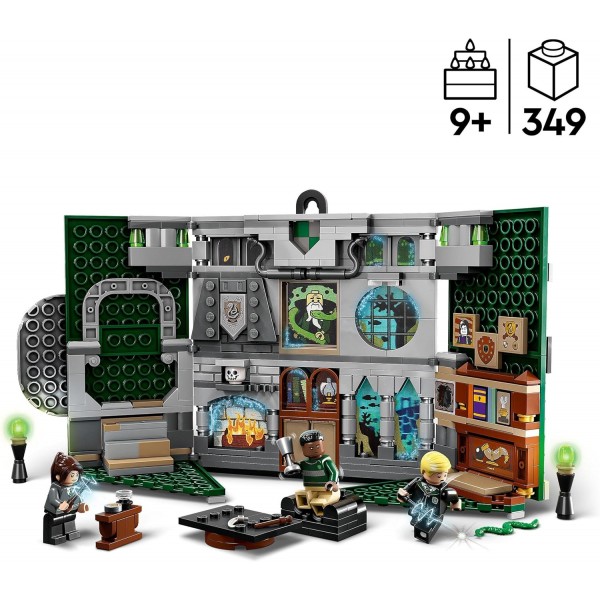 I fan di Harry Potter™ possono dimostrare il loro orgoglio per la casa di Serpeverde con questo stendardo della casa in mattoncini LEGO® (76410). Un fantastico regalo per ogni occasione per i bambini dai 9 anni in su, con una tessera stampata con lo stemma di Serpeverde e un gancio per appenderlo alla parete. Lo stendardo si apre per rivelare un’affascinante ricostruzione della Sala comune di Serpeverde con divano, lampade e gradini costruibili. Un pannello lenticolare a scorrimento crea magicieffetti 3D, tra cui mostruosi occhi mobili, una luce che si accende e si spegne, un messaggio segreto che appare nell’armadio e altro ancora.