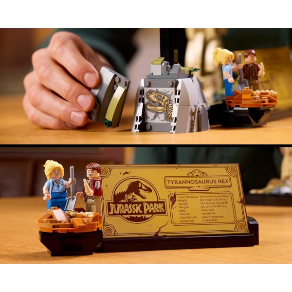 Questo modello di dinosauro LEGO® Jurassic World collezionabile contiene uno scheletro fossile di T. rex in scala 1:12 con articolazioni mobili, inclusi cranio, mascella, bracci snodabili e coda. È presente anche una targa informativa che può essere fissata all’espositore, sorprese nascoste nel sito di scavo che includono un pezzo di “ambra” e 2 minifigure del film Jurassic Park del 1993: Ellie Sattler e Alan Grant.