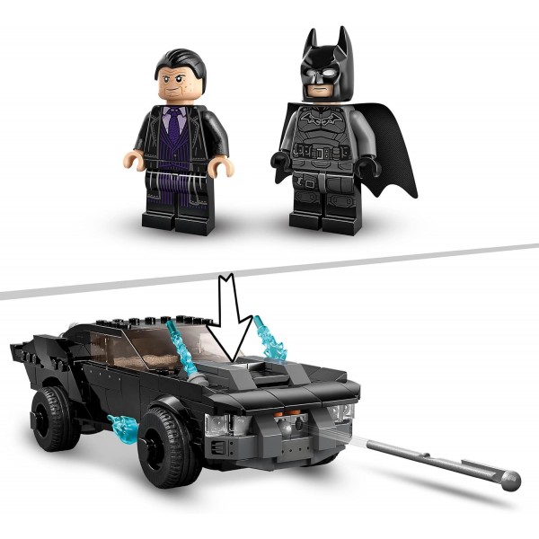 Questa Batmobile pronta per la battaglia è caratterizzata da 2 shooter caricati a molla che lanciano mega missili dalla parte anteriore, sia simultaneamente che individualmente, premendo le placche sul cofano. Il parabrezza e il tetto si sollevano in modo che la minifigure di Batman si possa sedere nell'abitacolo. C'è anche spazio per un passeggero. L'azione può diventare più intensa con l'aggiunta di elementi a fiamma blu attaccati allo scarico. Il set comprende 2 minifigure: Batman, con un mantello in tessuto, e The Penguin, con shooter e lanciarazzi in mano, dotato di shooter integrato che spara pezzi circolari. Quando a fine giornata le fantasiose avventure dei supereroi giungono a termine, questo versatile veicolo diventa un magnifico pezzo da esposizione per le camerette dei bambini.