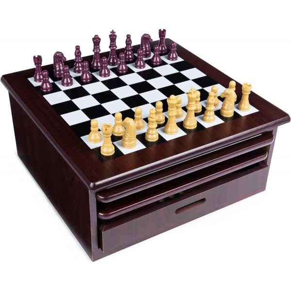 Perfetto per passare ore di divertimento in famiglia e con amici. Bellissima pianta, realizzata in legno di alta qualità, per dama e scacchi. Scopri molti giochi, tra cui scacchi con pezzi di scacchi, scacchiera da dama, serpente e scale, ludo e tris, c'è un gioco per tutti. Include: un mobile in legno con scacchiera, cassetto e 2 scacchiere rimovibili, 32 pezzi di scacchi, 32 pezzi da dam, 30 bastoncini da ritiro, 48 pezzi di mancala, 60 biglie di plastica, 16 pedoni di plastica, 54 carte da gioco, 2 dadi