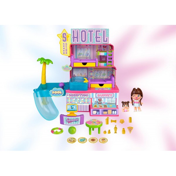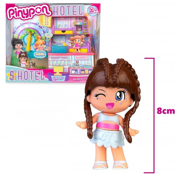 Il Pinypon Hotel 5 stelle è già assemblato, pronto per avventure immediate. Con un'accogliente reception e diverse opzioni di sala, è l'ambiente perfetto per creare infinite storie. L'hotel offre una varietà di camere, tra cui una camera familiare con tre letti e una lussuosa suite con letto king-size e vasca idromassaggio privata, garantendo un soggiorno confortevole e divertente per i Pinypon. Il buffet dell'hotel è una meraviglia culinaria, con un sistema rotante che presenta un'ampia gamma di opzioni per colazione, pranzo e cena. I Pinypon potranno godersi un banchetto diverso ad ogni pasto! L'hotel dispone di una piscina a sfioro che promette ore di divertimento. Include uno scivolo su cui Pinypon può scivolare e sguazzare mentre si gode una giornata di sole. Il set include due personaggi Pinypon e una varietà di accessori dettagliati che arricchiscono l'esperienza di gioco.