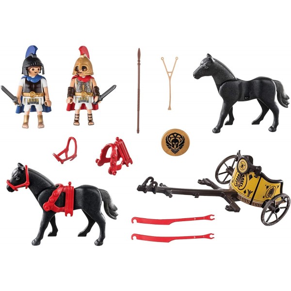 Achille e Patroclo. I due eroi con il carro di Achille si preparano per un'altra battaglia fuori dalle mura di Troia. Per molti anni gli amici Achille e Patroclo combattono nella guerra di Troia per la conquista di Troia. I due sono amici fin dall'infanzia e sono sempre fianco a fianco in battaglia. Ma un giorno Patroclo indossa l'armatura di Achille e va in battaglia da solo. Lì fu ucciso da Ettore, il principe di Troia, che erroneamente lo crede Achille. Achille è furioso per la morte del suo amico e si propone di vendicarlo e uccidere Ettore. Include i personaggi Playmobil Achille e Patroclo con elmo, spada e armatura, oltre un carro con due cavalli e altri extra.