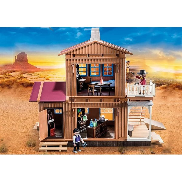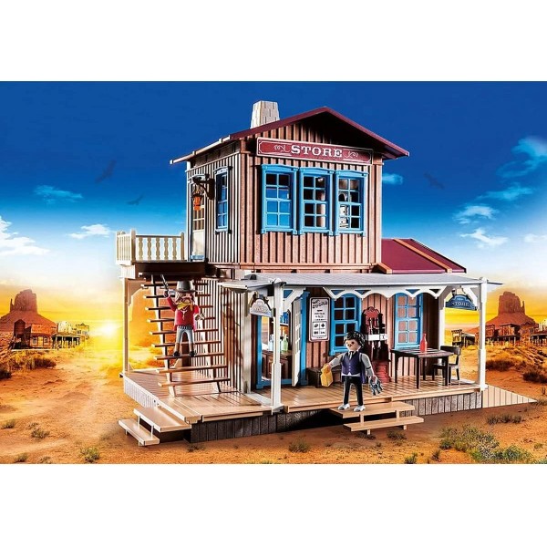 Anche i cowboy devono andare a fare shopping a volte. Com'è conveniente che ci sia il ben fornito Western Store nella Playmobil Western City. Che si tratti di cibo in scatola, forniture o medicinali qui tutti i desideri dei clienti sono soddisfatti. La sera, il venditore chiude la porta e va nella sua piccola stanza al piano di sopra. Qui ha un tavolo, una sedia e un comodo letto su cui riposare. Le chiavi del negozio sono conservate al sicuro nella segretaria. E la cosa migliore è che il modo di lavorare al mattino non è lontano. Include 2 personaggi Playmobil, 1 edificio negozio, 1 banco vendite, 1 registratore di cassa, 2 armadi, 1 armadietto per armi, 1 rampa, 3 scale, 2 pistole, 1 tavolo, 1 sedia, 1 panca, 1 letto, 1 lampada, 2 cartelli appesi, 2 libri, 3 lattine, 2 lattine, 2 lattine, 2 barattoli di cibo, 4 bottiglie, 2 barattoli, 2 boccette, 2 barattoli di unguento, 2 pacchetti di latte, 2 bustine di zucchero, 1 mazzo di chiavi, 1 pistola.