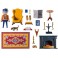 Salotto arredato con cura con camino, con un personaggio Playmobil, poltrona, libro, giornale, cane e camino per riscaldarsi. Il nonno gode delle tranquille ore serali leggere nel salone accanto al camino. Mentre il fuoco scoppietta comodamente, mette i piedi sullo sgabello e apre il giornale. Il suo fedele cane si mette a proprio agio davanti al fuoco caldo. Una volta studiate tutte le notizie della giornata, un libro emozionante giace pronto sul tavolo. Se arriva tardi i tronchi possono essere utilizzati per riscaldare il fuoco.