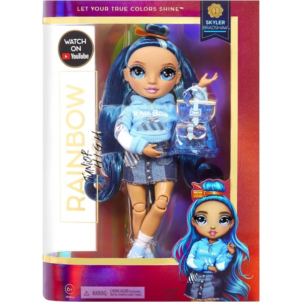 Fai brillare i colori della collezione Rainbow High Jr. High. Vieni a conoscere Skyler Bradshaw quando era giovane. Skyler è vestita di blu con un maglione in french terry con grafica arcobaleno, una gonna di jeans con borchie e sneakers alte. Ha anche uno zaino con un design in vinile cangiante, perfetto per riporre i suoi accessori. La confezione include: 1 bambola Skyler Bradshaw con abiti, un paio di scarpe e numerosi accessori, un paio di calzini, elastico per capelli, un pettine e uno zaino in morbido tessuto che si apre e si chiude