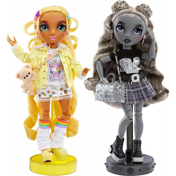 Insieme ai loro amici di Shadow High, le Madison Twins stanno dimostrando al mondo che bisogna essere orgogliosi di far brillare i propri colori. Esprimono la loro personalità unica attraverso i loro stili unici. Sunny indossa una maglietta kawaii, una gonna, una giacca di jeans, degli scaldamuscoli, Crocs e una borsetta. Luna indossa un top con borchie argentate, una gonna, una cintura e degli stivali con una borsetta stile cestino del pranzo. Sunny ha un'adorabile borsetta di peluche, scaldamuscoli arcobaleno, Crocs gialle, barrette arcobaleno e orecchini adorabili. Luna ha una borsa argentata stile lunch box, stivali neri con tacco largo, una cintura nera lucida e orecchini d'argento. Essendo entrambe completamente snodate, è facile e divertente giocarci. La testa, le braccia, le mani e le gambe si piegano per creare tante pose, compresa la spaccata! Oppure si possono esporre sul supporto per bambole incluso. Questa confezione in edizione speciale presenta le Rainbow High e le Shadow High Madison Twins nei loro caratteristici colori dell'arcobaleno, dai più vivaci ai più tenui