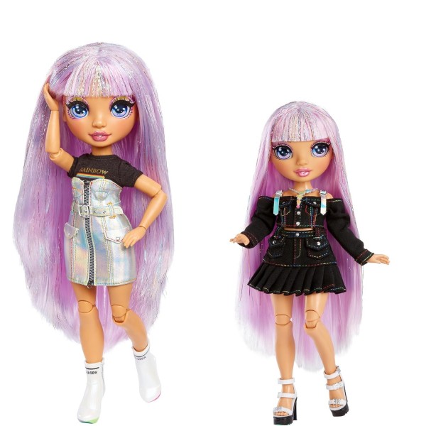 Avery Styles è vestita con una gonna e un top neri con finiture arcobaleno. Ha splendidi lineamenti, dettagli alla moda, lunghi capelli lisci viola + brillanti capelli arcobaleno, ciglia lunghe e occhi in vetro. Avery ha sempre uno stile unico per la scuola. Indossa un top con gonna coordinata, tacchi alti e uno zaino. Il suo zaino in morbido tessuto satinato si apre e si chiude ed è l'accessorio perfetto da abbinare al suo splendido outfit, per portare tutto ciò di cui ha bisogno per la scuola. Alta 22 cm, è tutta snodata per creare tante pose.
