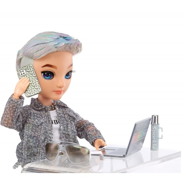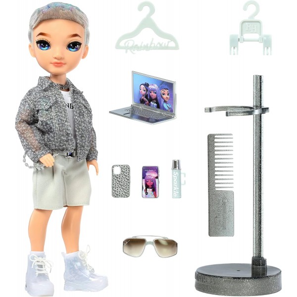 Aidan è una bambola sui toni del grigio, bianco e viola. Indossa una giacca iridescente, una maglietta, pantaloncini, calzini, una collana, scarpe e accessori. Ha i capelli con riflessi viola iridescenti, ciglia vere e occhi di vetro! Aidan ècompletamente snodabile ed è uno stilista e ha tutto l'essenziale per la sfilata. Ha in dotazione il kit di sopravvivenza per tutti i giorni: laptop, thermos e un adorabile cellulare con portacellulare! La confezione include: 1 bambola Aidan Russell, un paio di scarpe, occhiali da sole, computer portatile, thermos, un adorabile cellulare con portacellulare e supporto per bambole!