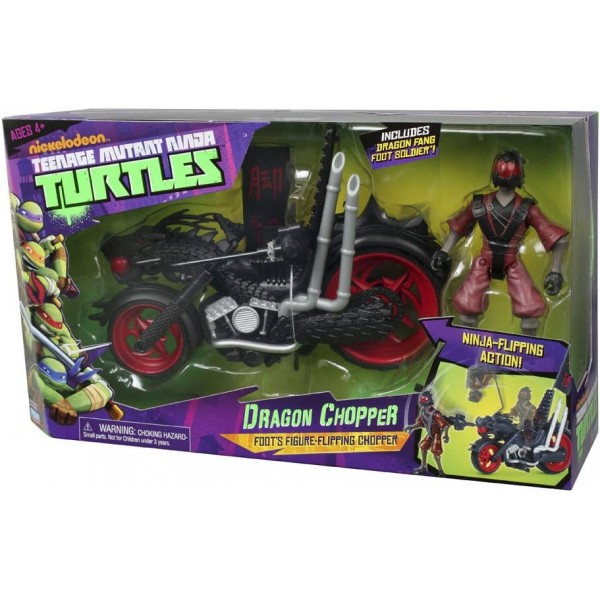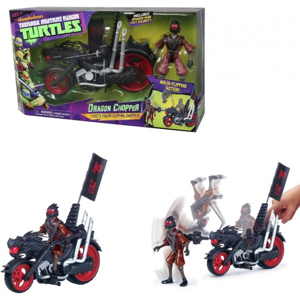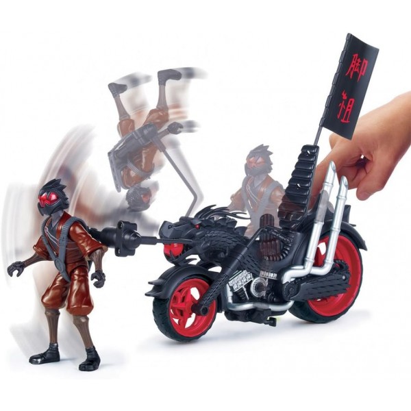 D'ora in poi, puoi facilmente entrare nel mondo delle Tartarughe Ninja e recitare le tue scene preferite insieme ai suoi personaggi. Il set include una moto drago con un personaggio del Clan Foot. Quando premiamo il pulsante dietro il sedile, il personaggio salterà fuori e farà una capriola.